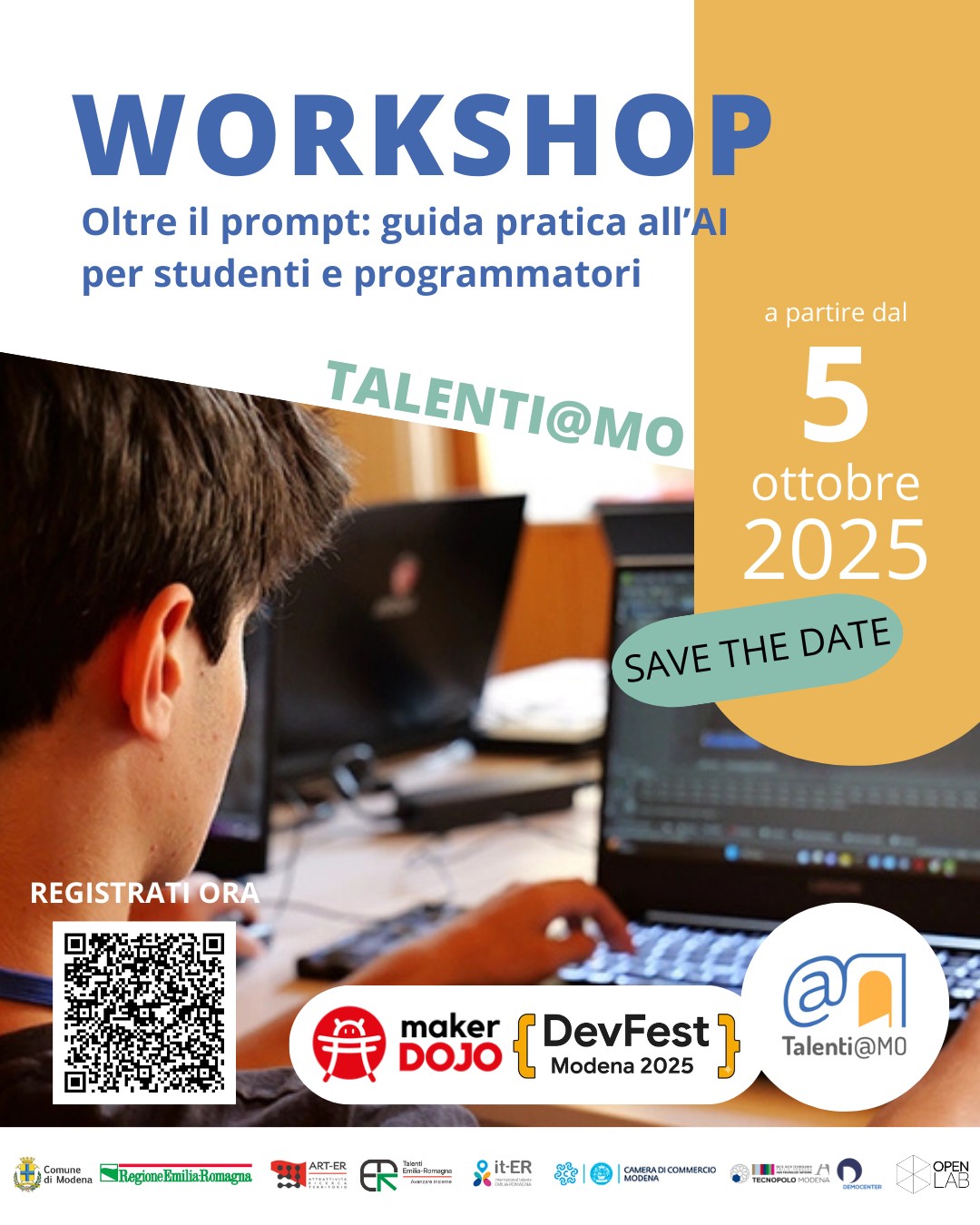 Il Workshop rientra nel progetto Talenti@MO del Comune di Modena, in collaborazione con Open Lab Srl, ART-ER S. cons. p. a., Camera di Commercio di Modena, Fondazione Democenter-Sipe e Tecnopolo di Modena.